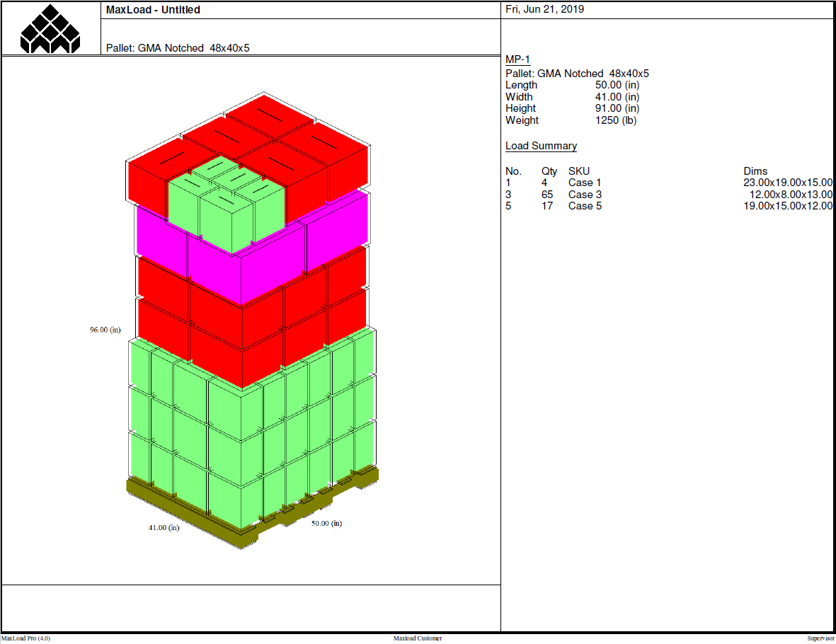 Si su carga contiene SKUs paletizados, estos informes le brindarán la vista gráfica en 3D de cada tarima junto con las dimensiones y el contenido de la carga.