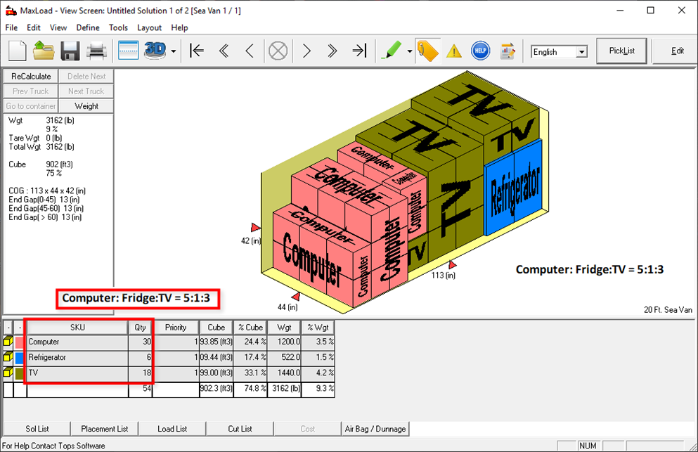 Cargue un contenedor lleno de SKU especificados en una proporción establecida. Por ejemplo, especifique una proporción de 4: 2: 1 y MaxLoad optimizará el contenedor con 4 sillas y 2 mesas de café por cada sofá cargado. MaxLoad Pro mantendrá esa relación para todo el camión o contenedor.