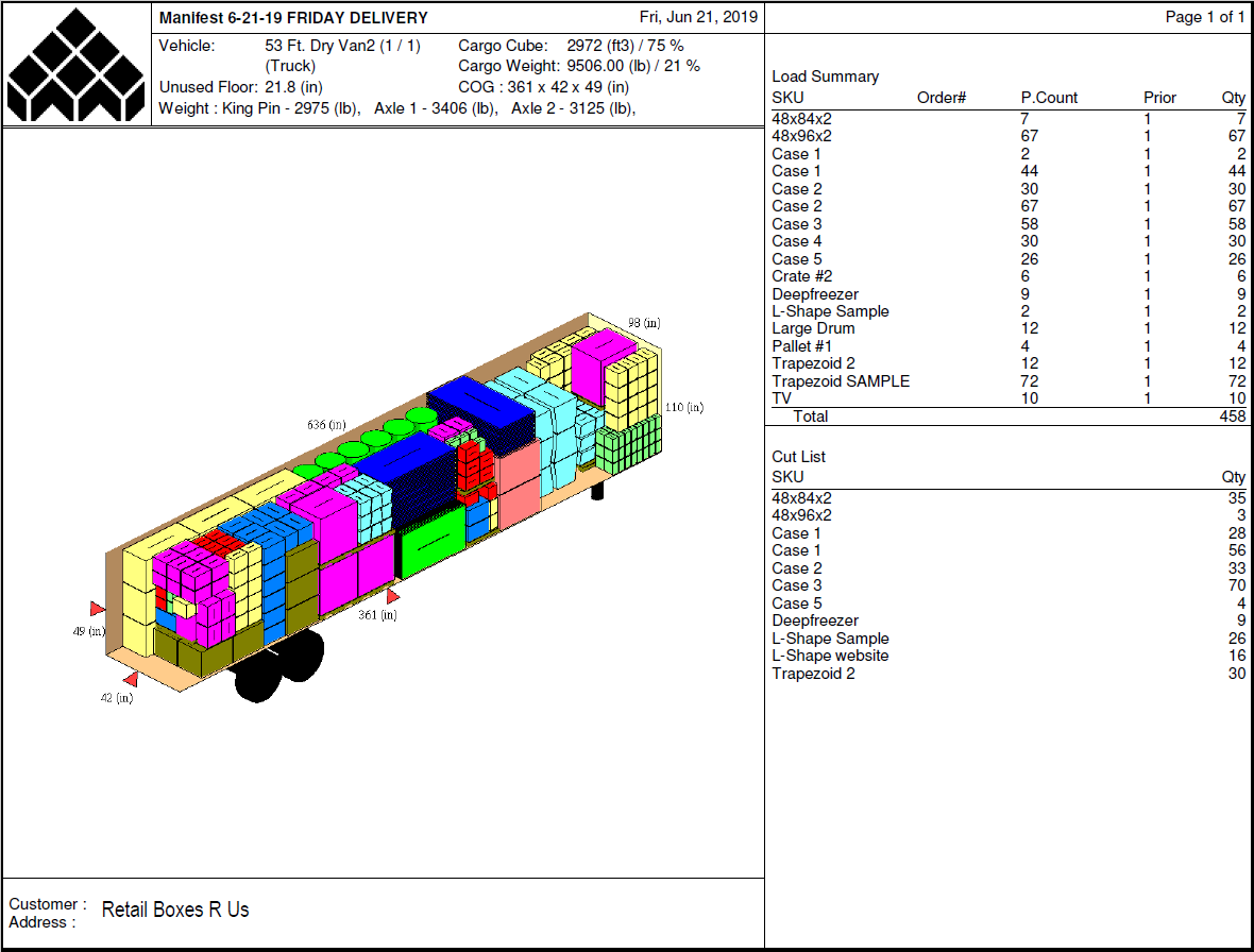 Los diagramas de carga proporcionan la vista 3D del vehículo cargado más un resumen de todos los SKU y cantidades cargadas dentro del vehículo. También se incluyen datos resumidos para el camión o contenedor: cubicaje de carga total, peso de la carga, centro de gravedad, pesos en el pivote principal y los ejes, espacio de piso no utilizado.
