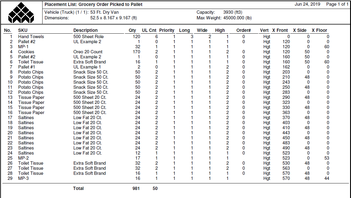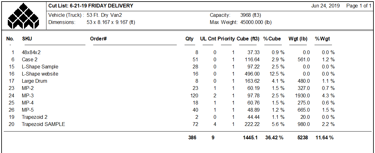 La lista de carga ofrece una lista resumida de cada SKU y sus cantidades dentro de cada vehículo o contenedor, junto con el peso y el volumen de cada SKU y su porcentaje.