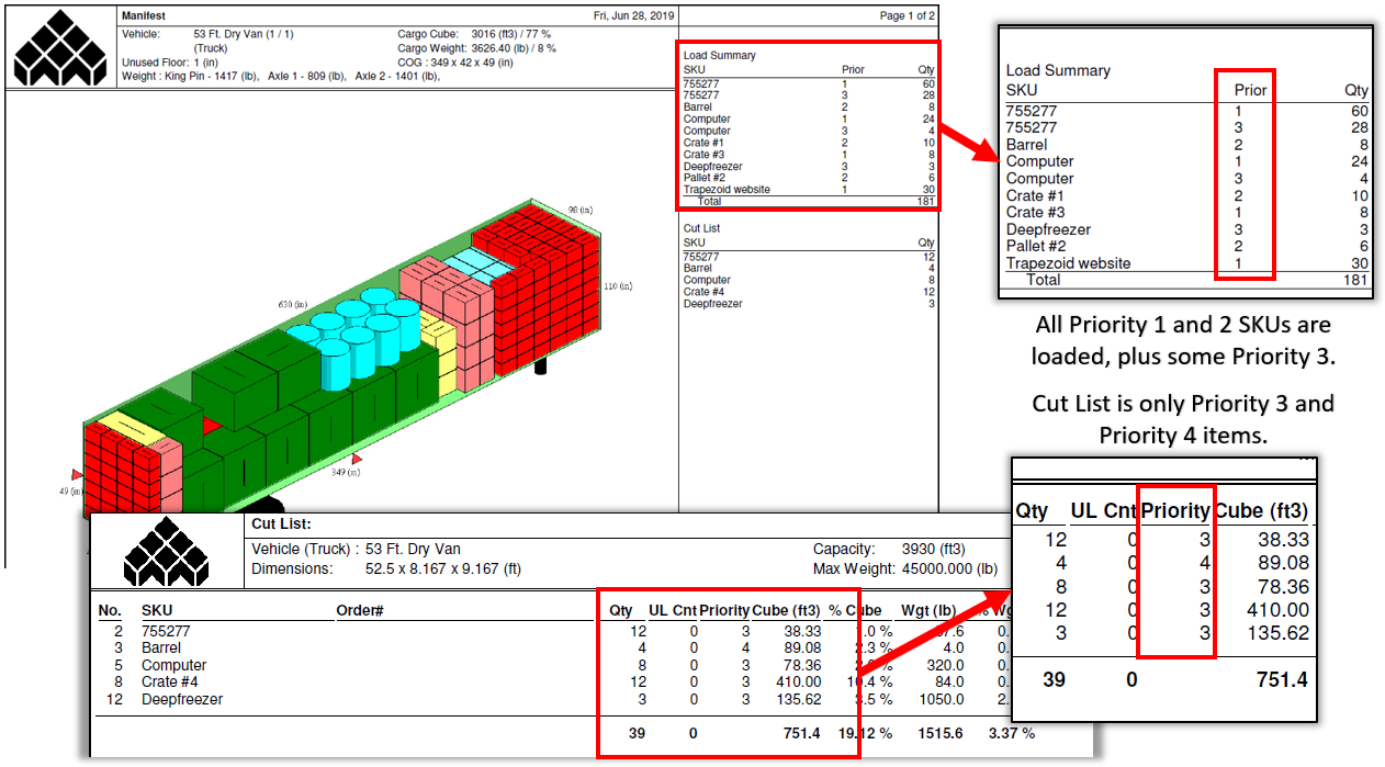 Desde el centro de distribución hasta las tiendas minoristas, los usuarios pueden cargar SKU en camiones de acuerdo con prioridad de carga y/o multi-parada. Si bien los SKU de la misma prioridad o parada están próximos entre sí, los usuarios pueden especificar que no haya superposición de espacio entre las paradas adyacentes o permitir cierta tolerancia de superposición para maximizar la utilización del espacio.